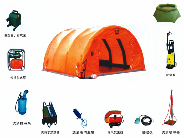 对受到有毒物质污染的人体进行喷淋洗消,也可以做临时会议室、指挥部、紧急救护场所等。帐篷展开面积30m2以上。配有电动充、排气泵,洗消供水泵,洗消喷枪,移动式高压洗消泵(含喷枪),密闭式公众洗消帐篷,洗消废水回收袋等设备。
